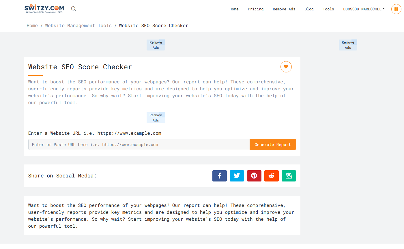 Open your browser and go to Swiitzy’s SEO Score Checker tool page.
